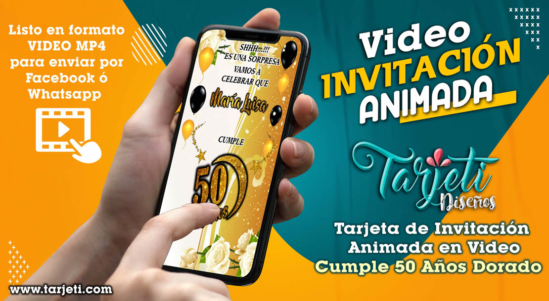 Video Invitación de 50 Dorado en MP4, ahorra tiempo y dinero enviando de esta forma novedosa tus invitaciones, te enviamos el video en formato MP4 para reenviar a todos tus contactos de Whatsapp, Facebook, TikTok etc., te brindamos este servicio personalizando el texto con el nombre del cumpleañero o cumpleañera, día, hora, lugar y 3 fotos.