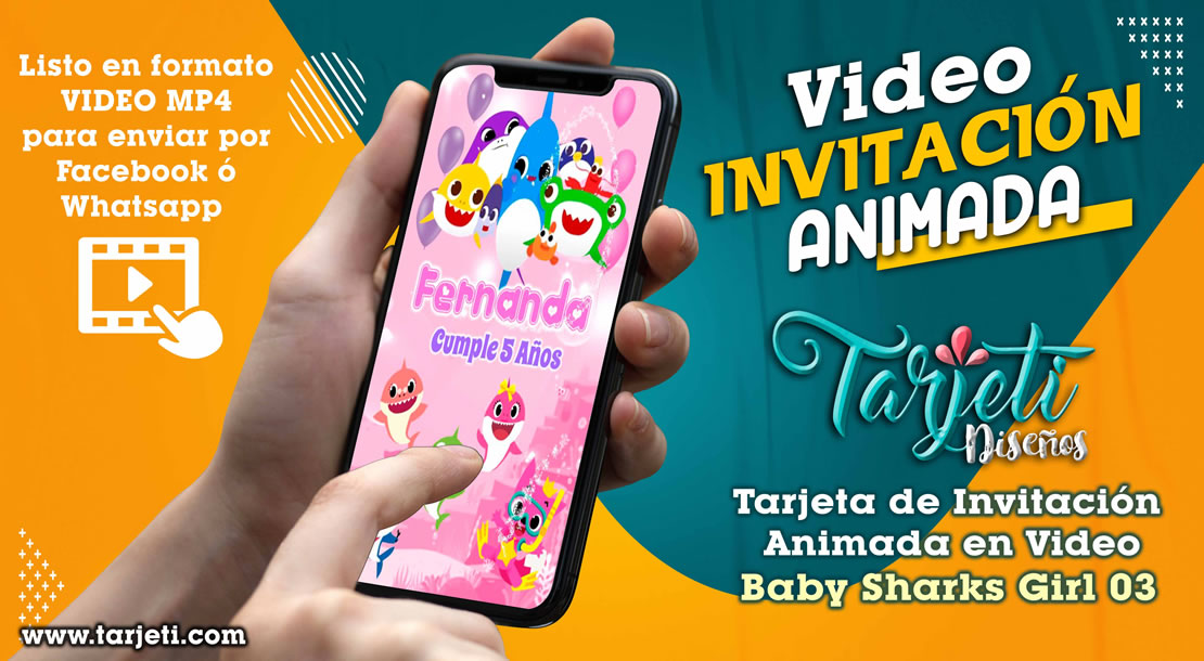 Video Invitación de Baby Sharks Girl 03 en MP4, ahorra tiempo y dinero enviando de esta forma novedosa tus invitaciones, te enviamos el video en formato MP4 para reenviar a todos tus contactos de Whatsapp, Facebook, TikTok etc., te brindamos este servicio personalizando el texto con el nombre del cumpleañero o cumpleañera, día, hora, lugar y 3 fotos.