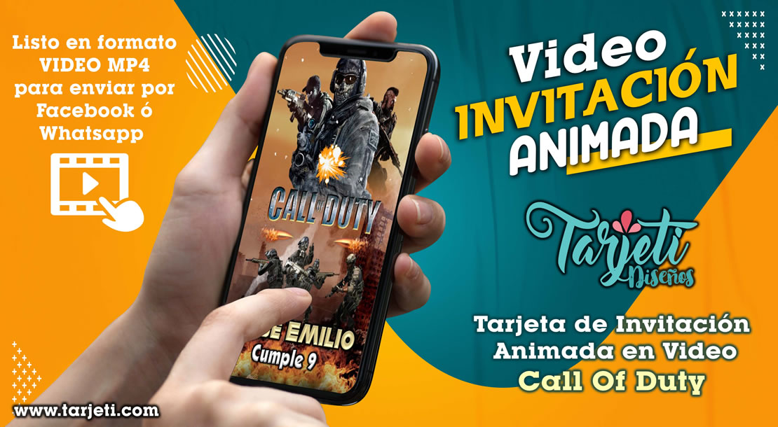 Video Invitación de Call Of Duty en MP4, ahorra tiempo y dinero enviando de esta forma novedosa tus invitaciones, te enviamos el video en formato MP4 para reenviar a todos tus contactos de Whatsapp, Facebook, TikTok etc., te brindamos este servicio personalizando el texto con el nombre del cumpleañero o cumpleañera, día, hora, lugar y 3 fotos.