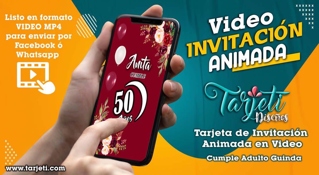 Video Invitación de Cumple Adulto Guinda 50 Años en MP4, ahorra tiempo y dinero enviando de esta forma novedosa tus invitaciones, te enviamos el video en formato MP4 para reenviar a todos tus contactos de Whatsapp, Facebook, TikTok etc., te brindamos este servicio personalizando el texto con el nombre del cumpleañero o cumpleañera, día, hora, lugar y 3 fotos.