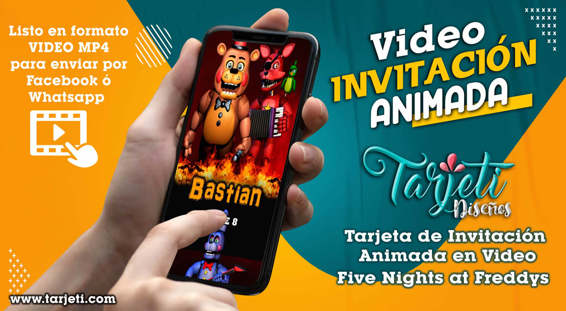 Video Invitación de Five Nights at Freddys en MP4, ahorra tiempo y dinero enviando de esta forma novedosa tus invitaciones, te enviamos el video en formato MP4 para reenviar a todos tus contactos de Whatsapp, Facebook, TikTok etc., te brindamos este servicio personalizando el texto con el nombre del cumpleañero o cumpleañera, día, hora, lugar y 3 fotos.