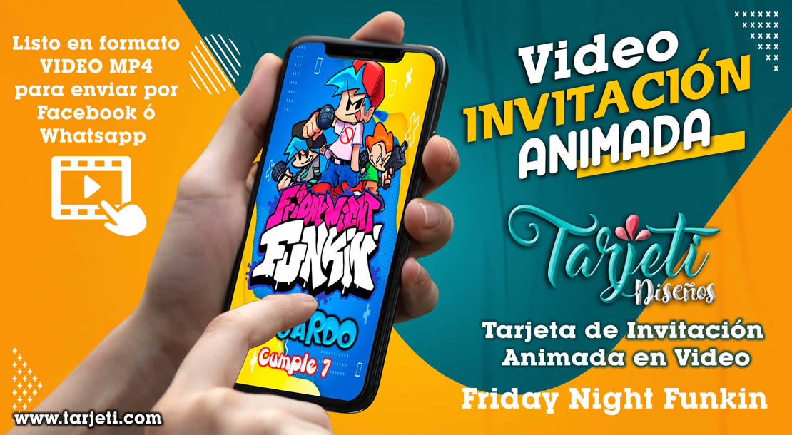 Video Invitación de Friday Night Funkin en MP4, ahorra tiempo y dinero enviando de esta forma novedosa tus invitaciones, te enviamos el video en formato MP4 para reenviar a todos tus contactos de Whatsapp, Facebook, TikTok etc., te brindamos este servicio personalizando el texto con el nombre del cumpleañero o cumpleañera, día, hora, lugar y 3 fotos.