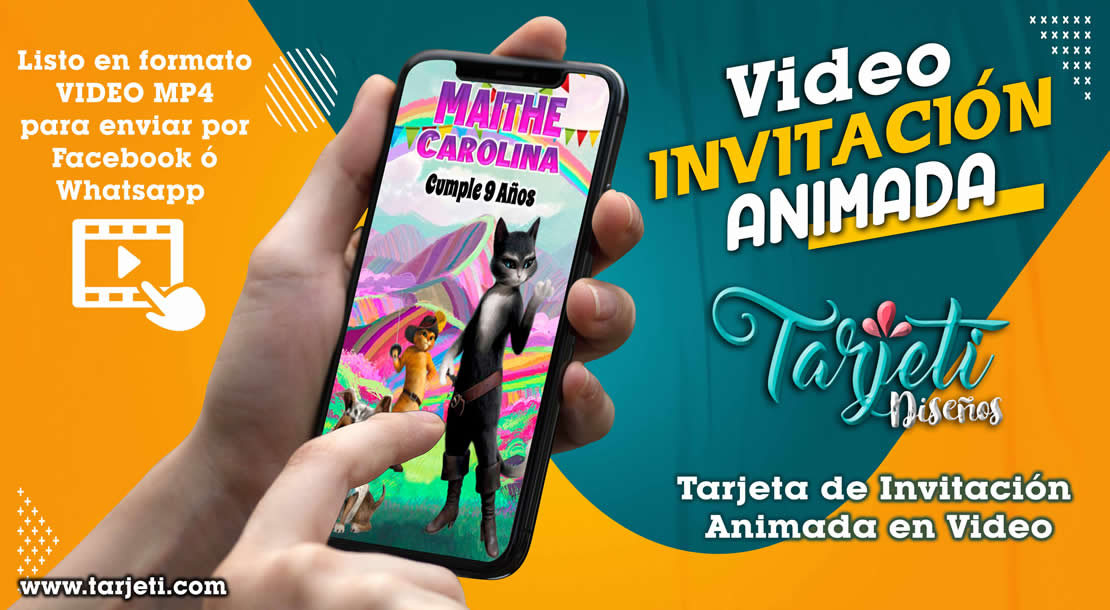Video Invitación de Gato con Botas Kitty en MP4, ahorra tiempo y dinero enviando de esta forma novedosa tus invitaciones, te enviamos el video en formato MP4 para reenviar a todos tus contactos de Whatsapp, Facebook, TikTok etc., te brindamos este servicio personalizando el texto con el nombre del cumpleañero o cumpleañera, día, hora, lugar y 3 fotos.