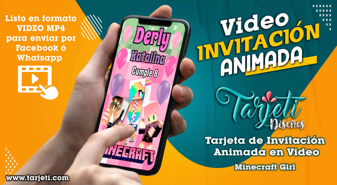 Video Invitación de Minecraft Niña Girl en MP4, ahorra tiempo y dinero enviando de esta forma novedosa tus invitaciones, te enviamos el  video en formato MP4 para reenviar a todos tus contactos de Whatsapp, Facebook, TikTok etc., te brindamos este servicio  personalizando el texto con el nombre del cumpleañero o cumpleañera, día, hora, lugar y 3 fotos.