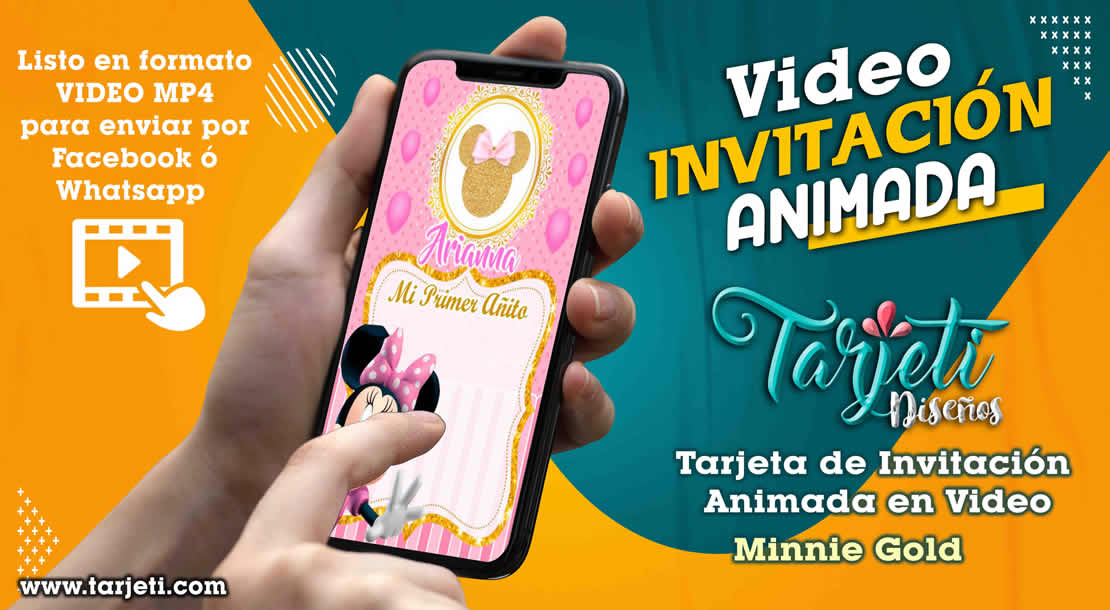 Video Invitación de Minnie Gold en MP4, ahorra tiempo y dinero enviando de esta forma novedosa tus invitaciones, te enviamos el video en formato MP4 para reenviar a todos tus contactos de Whatsapp, Facebook, TikTok etc., te brindamos este servicio personalizando el texto con el nombre del cumpleañero o cumpleañera, día, hora, lugar y 3 fotos.