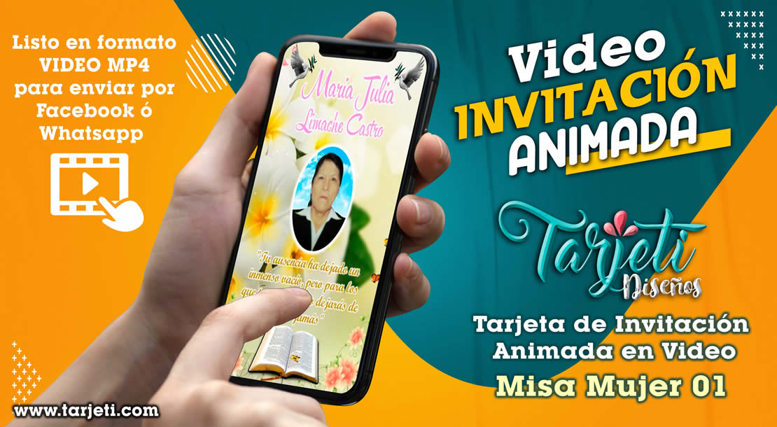 Video Invitación de Misa Mujer 01 en MP4, ahorra tiempo y dinero enviando de esta forma novedosa tus invitaciones, te enviamos el video en formato MP4 para reenviar a todos tus contactos de Whatsapp, Facebook, TikTok etc., te brindamos este servicio personalizando el texto con el nombre del cumpleañero o cumpleañera, día, hora, lugar y 3 fotos.