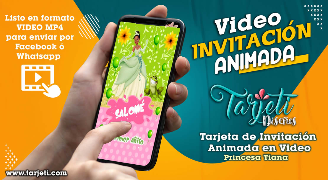Video Invitación de Princesa Tiana en MP4, ahorra tiempo y dinero enviando de esta forma novedosa tus invitaciones, te enviamos el video en formato MP4 para reenviar a todos tus contactos de Whatsapp, Facebook, TikTok etc., te brindamos este servicio personalizando el texto con el nombre del cumpleañero o cumpleañera, día, hora, lugar y 3 fotos.